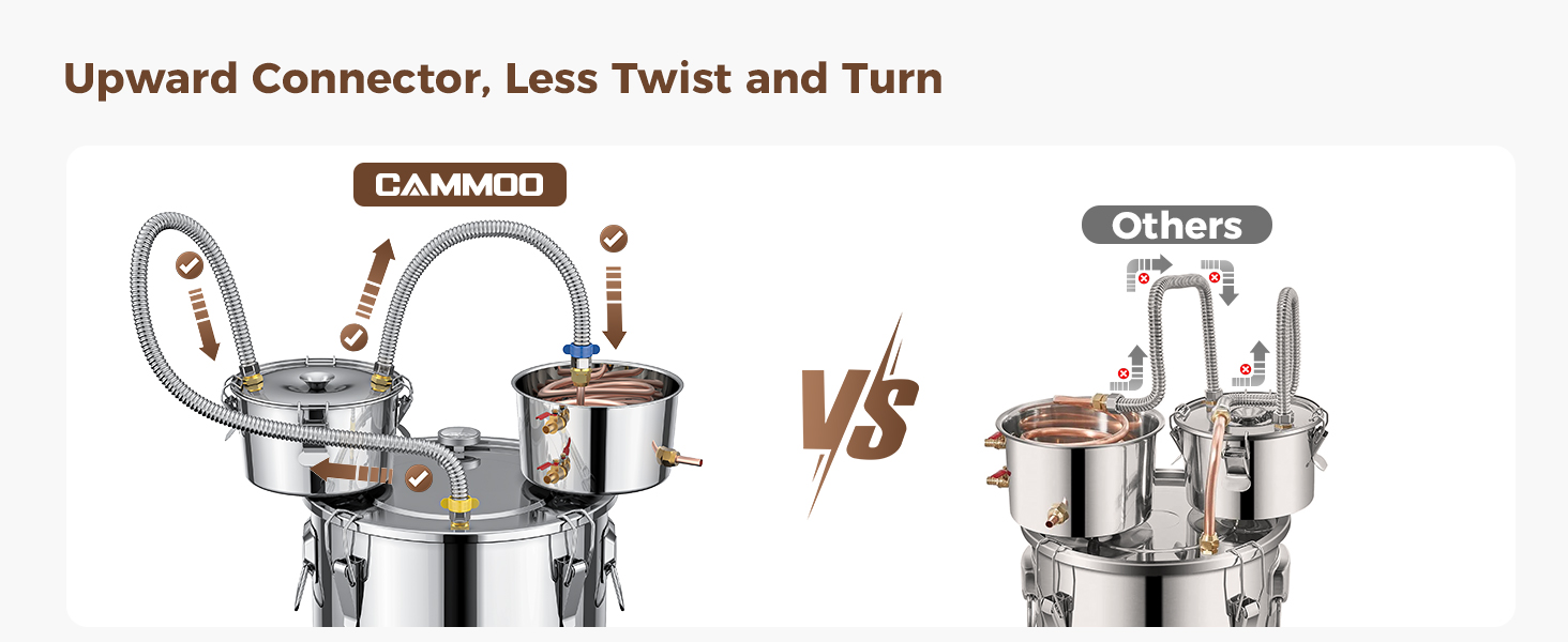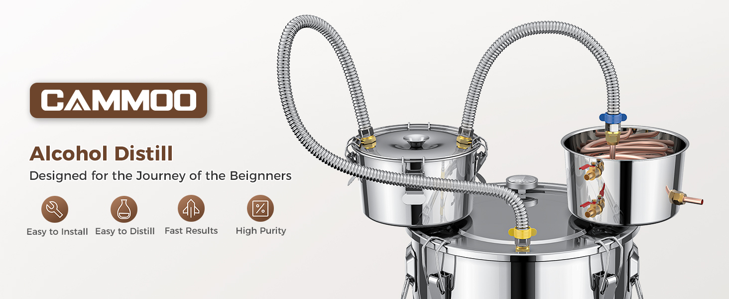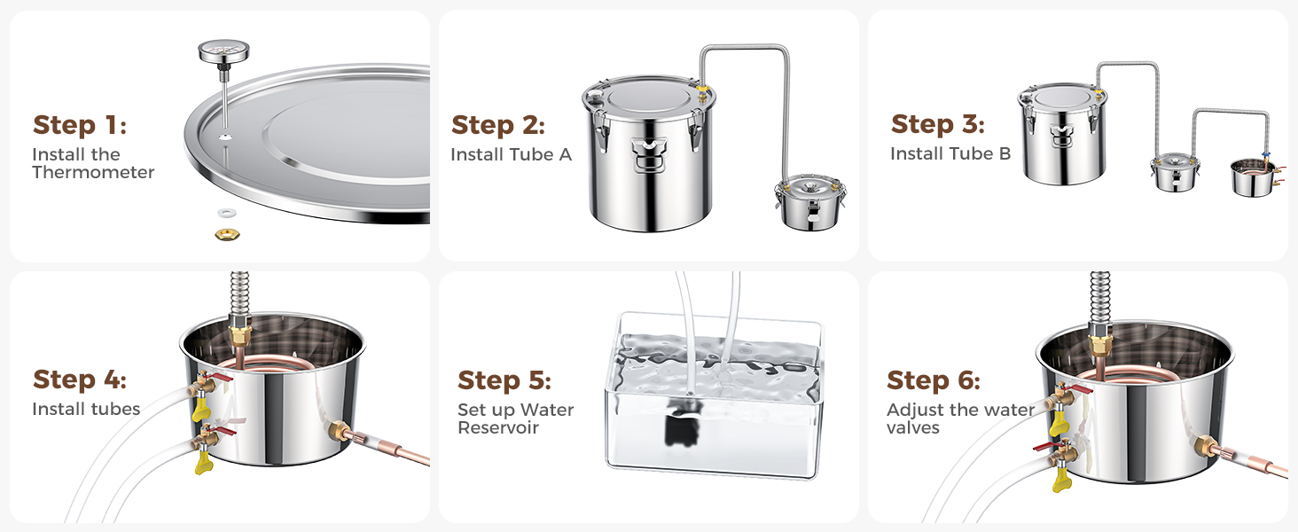 - EASY TO INSTALL: We've made installation a breeze with detailed instructions and video tutorials. Even if you're new to distilling, you can easily set up the distiller in just 6 steps and start your journey. The distiller features an adjustable 304 stainless steel connection tube (50cm + 60cm) that can be customized to fit your space, ensuring easy placement of the Thump keg and condenser. The upward design of the condenser connection further simplifies the process, avoiding unnecessary adjustments and ensuring a smooth distilling experience.