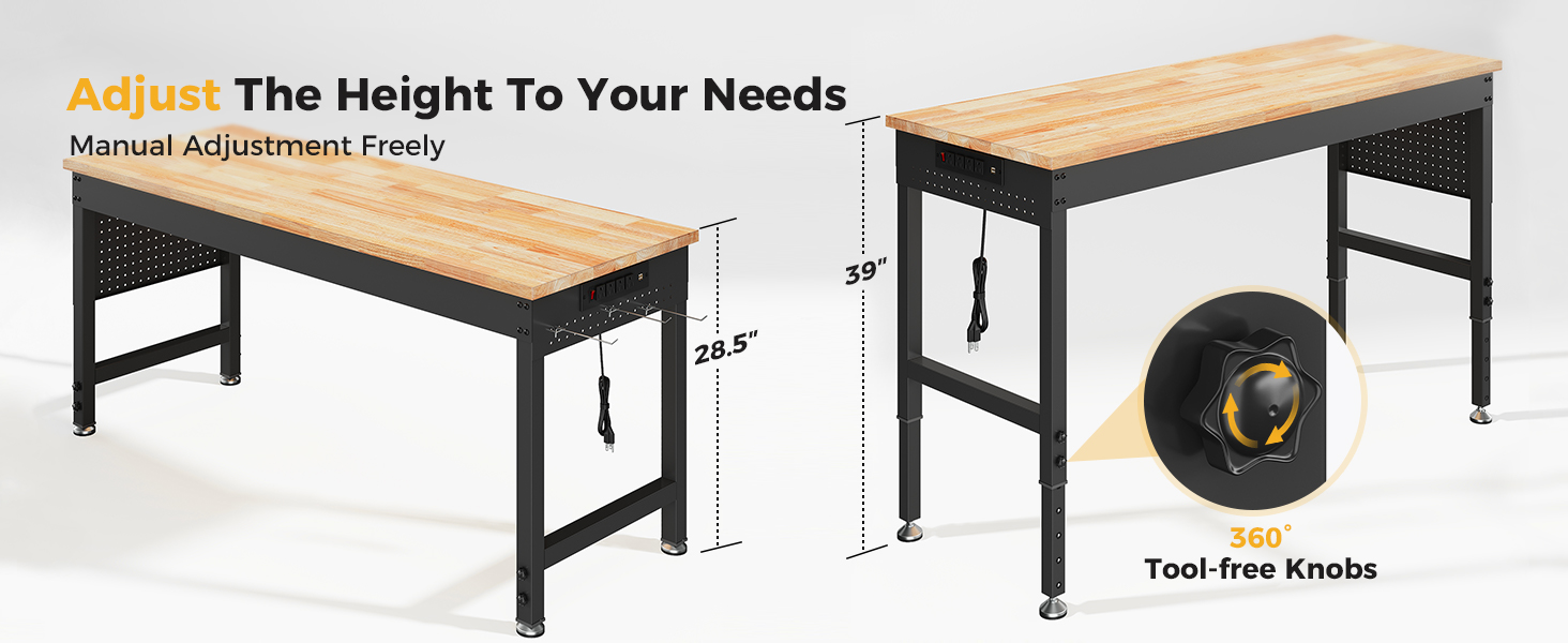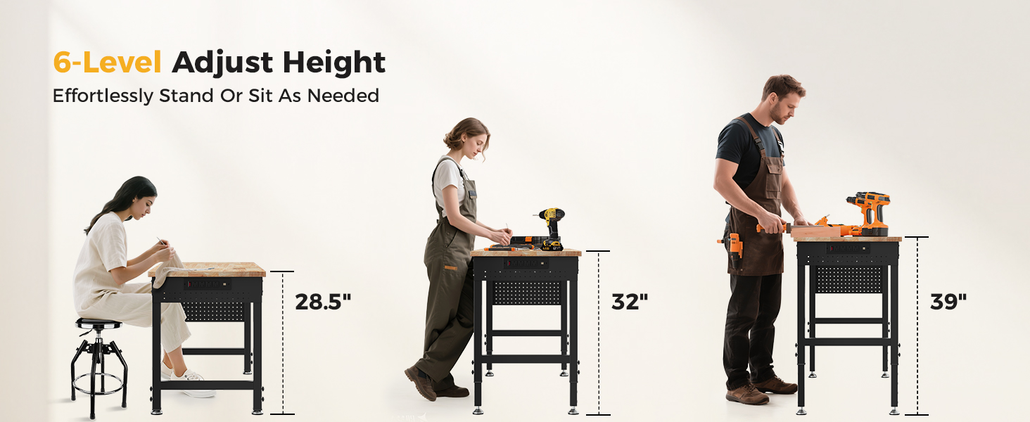 - Multi-level height adjustment: The adjustable workbench has six height settings, and 360° tool-free knobs help us adjust freely, ranging from 28.5" to 39", and no additional tools are required;The adjustable glides are adjustable to accommodate various flooring types. Working while standing or sitting is quite convenient.