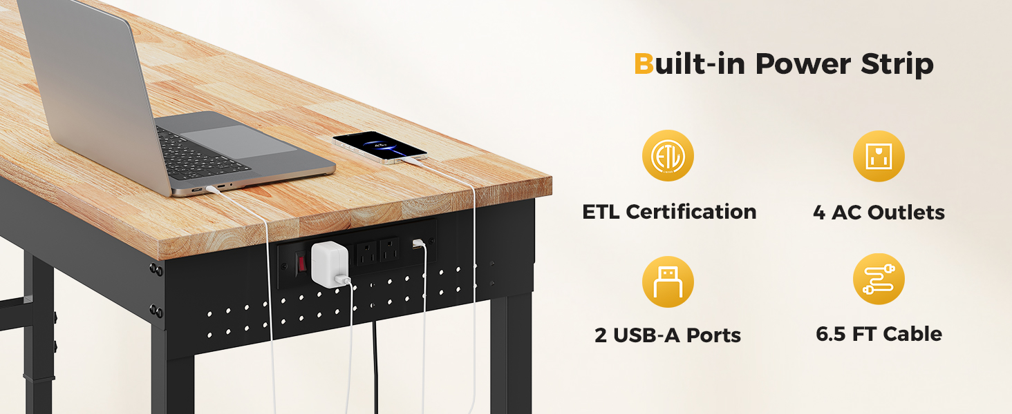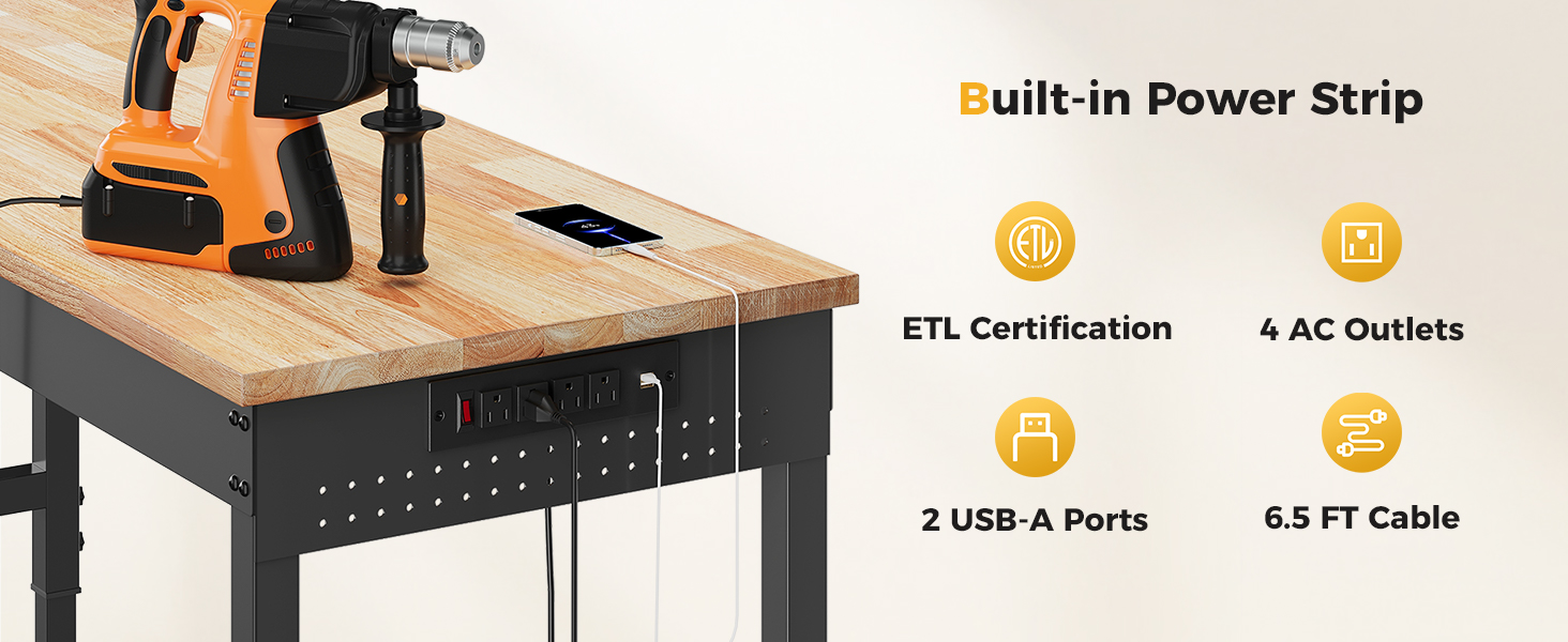 - ETL Certification Power Strip:The ETL-certified built-in power strip features 4 AC outlets, 2 USB ports, and 1 switch, along with a 6.5 ft long wire that is both safe and durable. This design makes it easy to equip the worktable with various electrical tools and lamps.