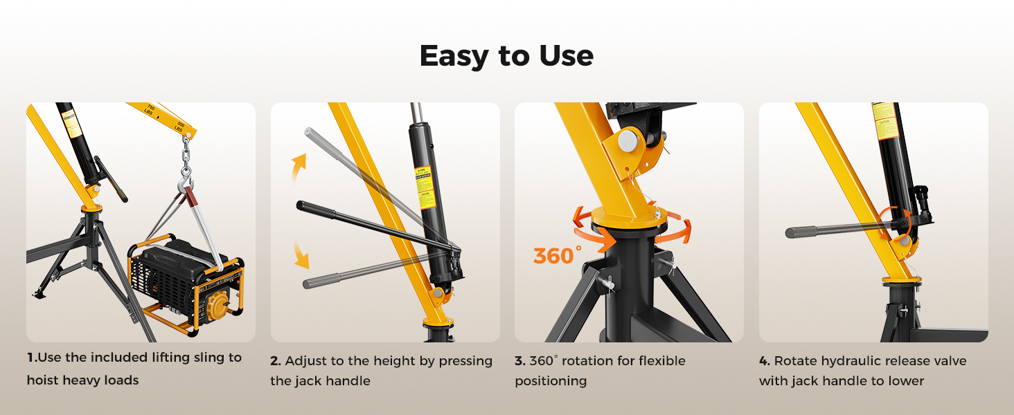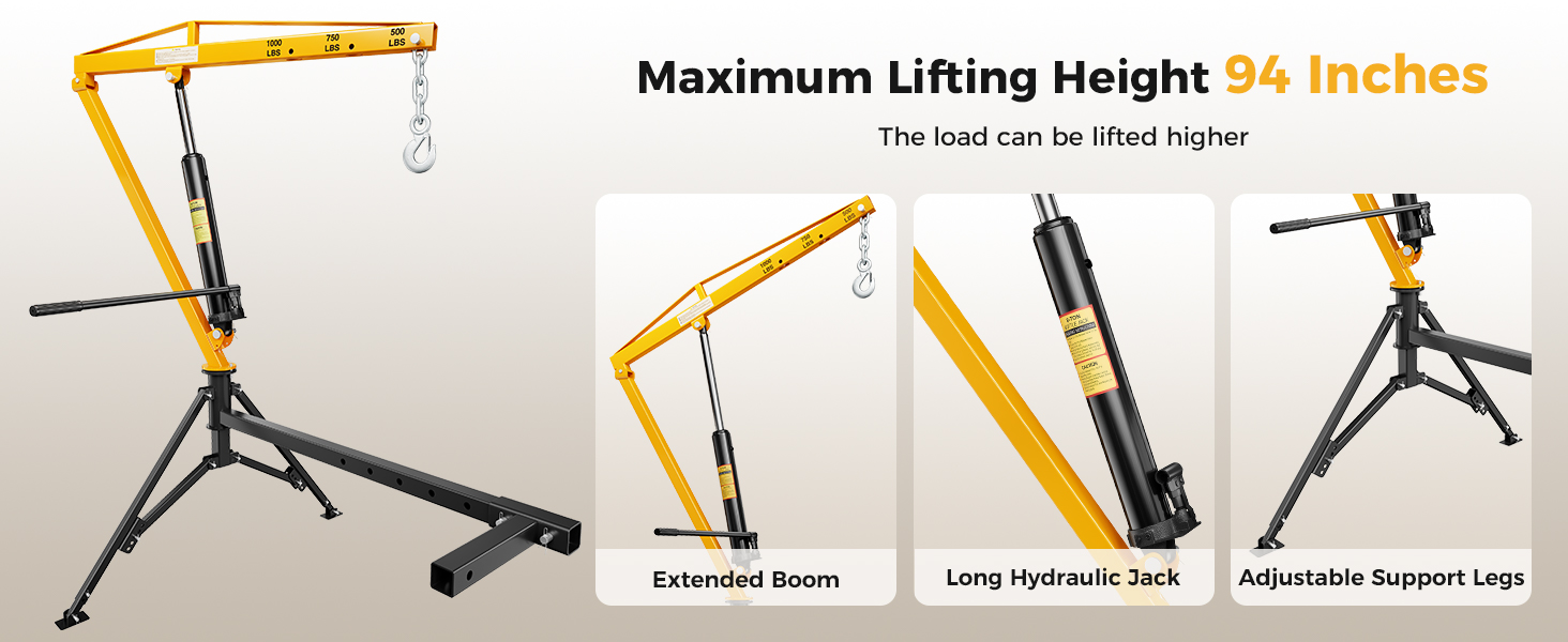 - Customizable Lift Height of up to 94'': The extended boom of our hydraulic crane, combined with a jack extension and adjustable support legs, provides a lifting range of 16-94 inches, ensuring safer loading and unloading. Avoid cargo colliding with your truck bed with this Heavy-Duty Hydraulic Crane!