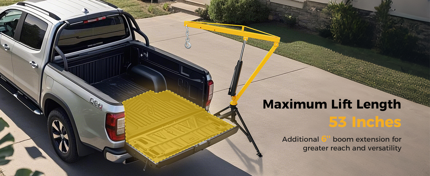 - Extended Lifting Length of up to 53'': Extend further with an additional 6-inch extended boom, increasing the lifting length of the pickup truck crane to 53 inches. With 360° rotation, this hydraulic crane offers more flexibility, allowing you to precisely position loads across your truck bed for maximum efficiency.