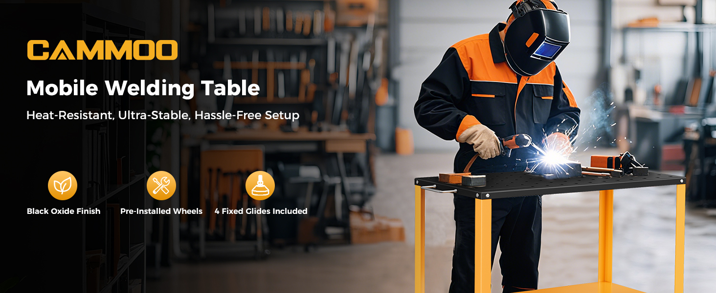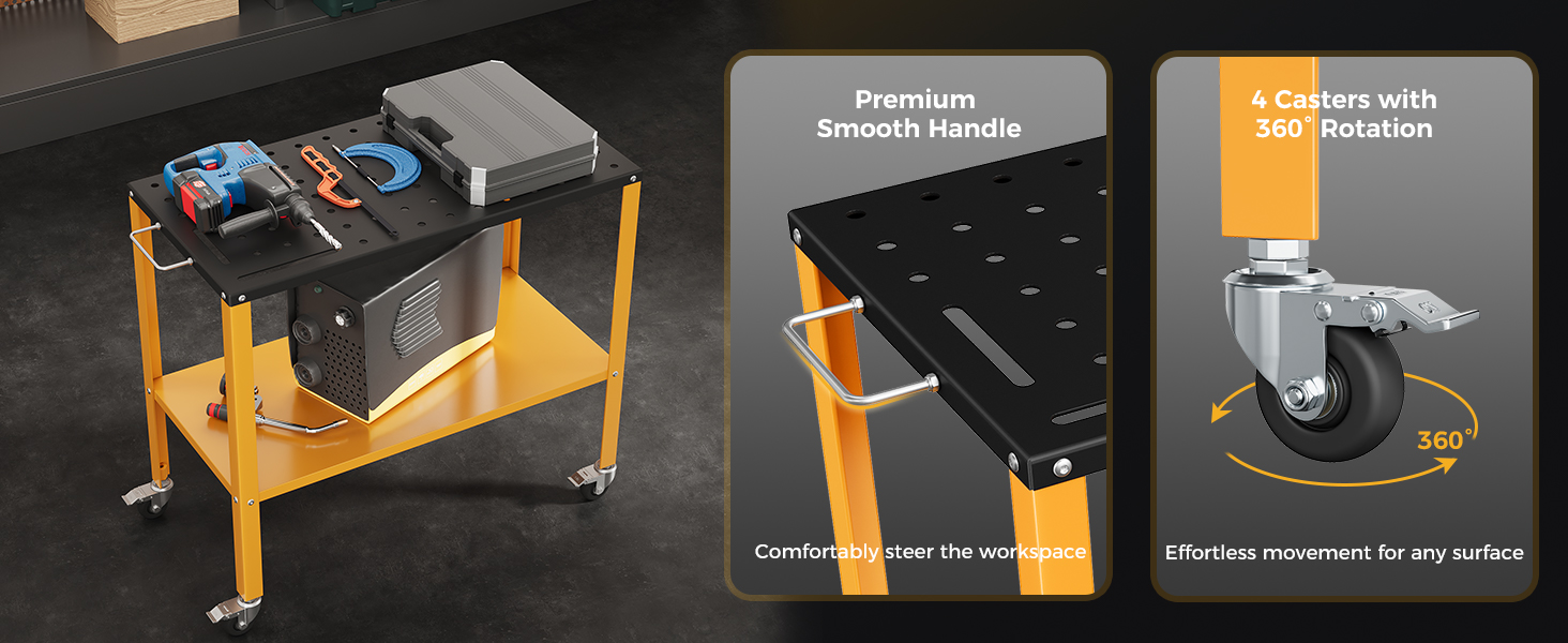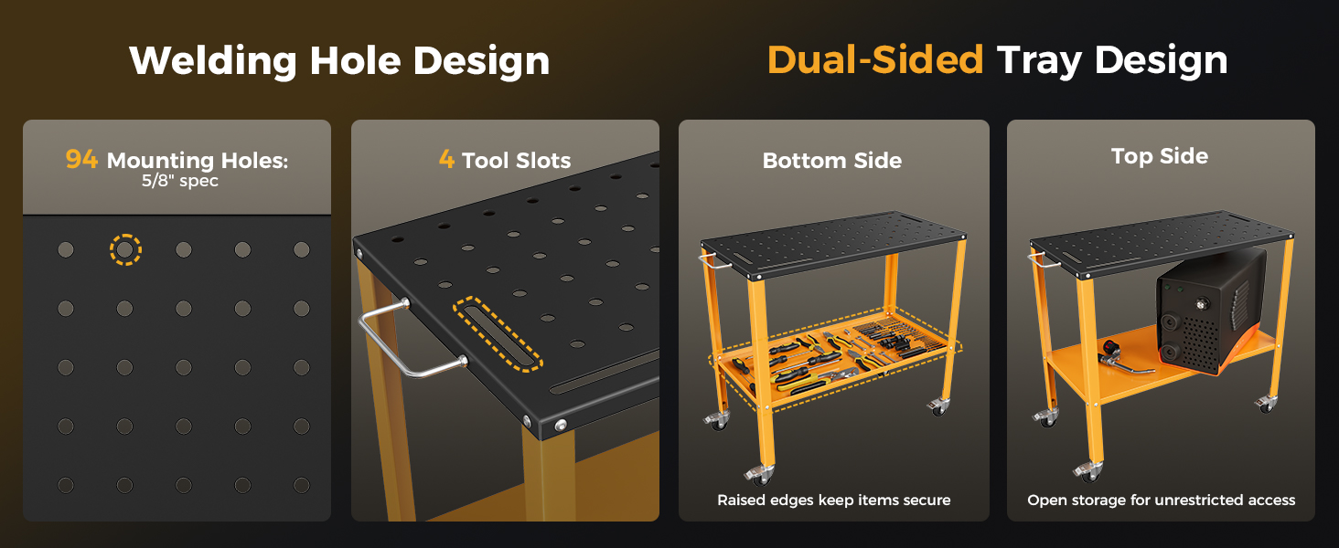 - Smart Under-Table Storage – Keep tools and accessories organized and within reach using the dual-sided tool tray, boosting efficiency and minimizing downtime.Designed for Durability, Mobility, and Convenience — This welding workbench handles heavy loads, resists heat, and simplifies workflow.