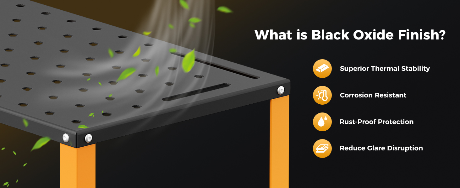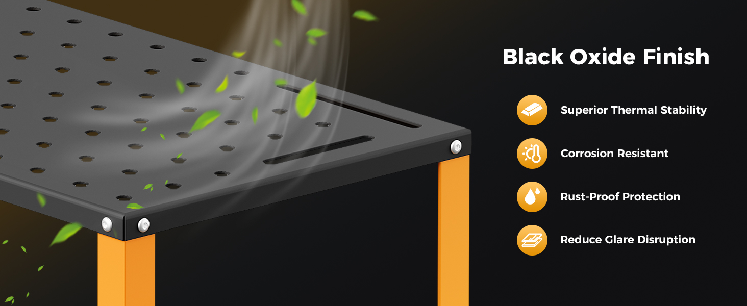 - Heat-Resistant & Safe – Tackle welding projects confidently with a 36" x 18" cold-rolled steel tabletop featuring black oxide treatment and anti-rust coating. The 94 pre-drilled 5/8" mounting holes and 4 tool slots are designed to endure high temperatures and resist corrosion.