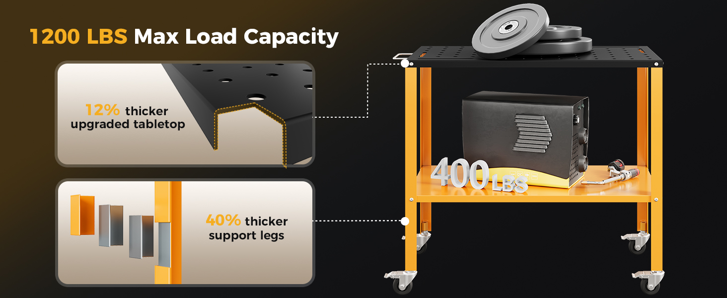 - 1200LBS Heavy-Duty Load Capacity – Built with reinforced 3.5mm steel legs and a 2.8mm-thick desktop, this supports professional welding equipment and heavy materials without wobbling, ideal for workshops and job sites.