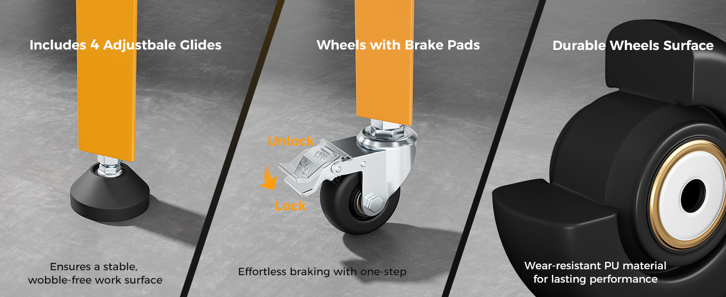 - Stable & Mobile Work Surface – Move smoothly across any terrain with 3" swivel casters, lock them in place for instant stability. Free 4 Fixed Glides keep the cart steady during precision tasks.